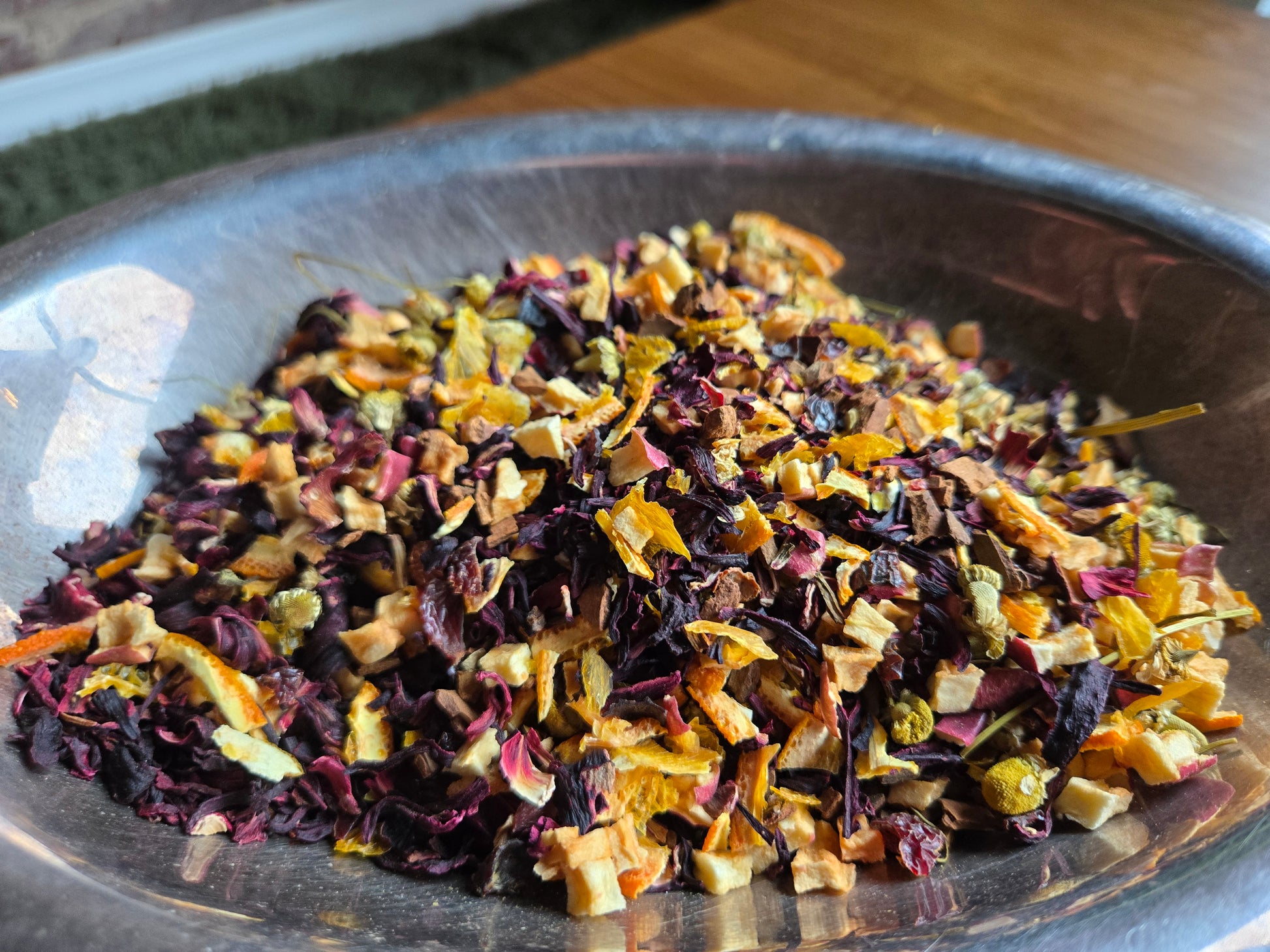 Apple pieces, hibiscus, rosehips, orange peel, cinnamon, chamomile, calendula