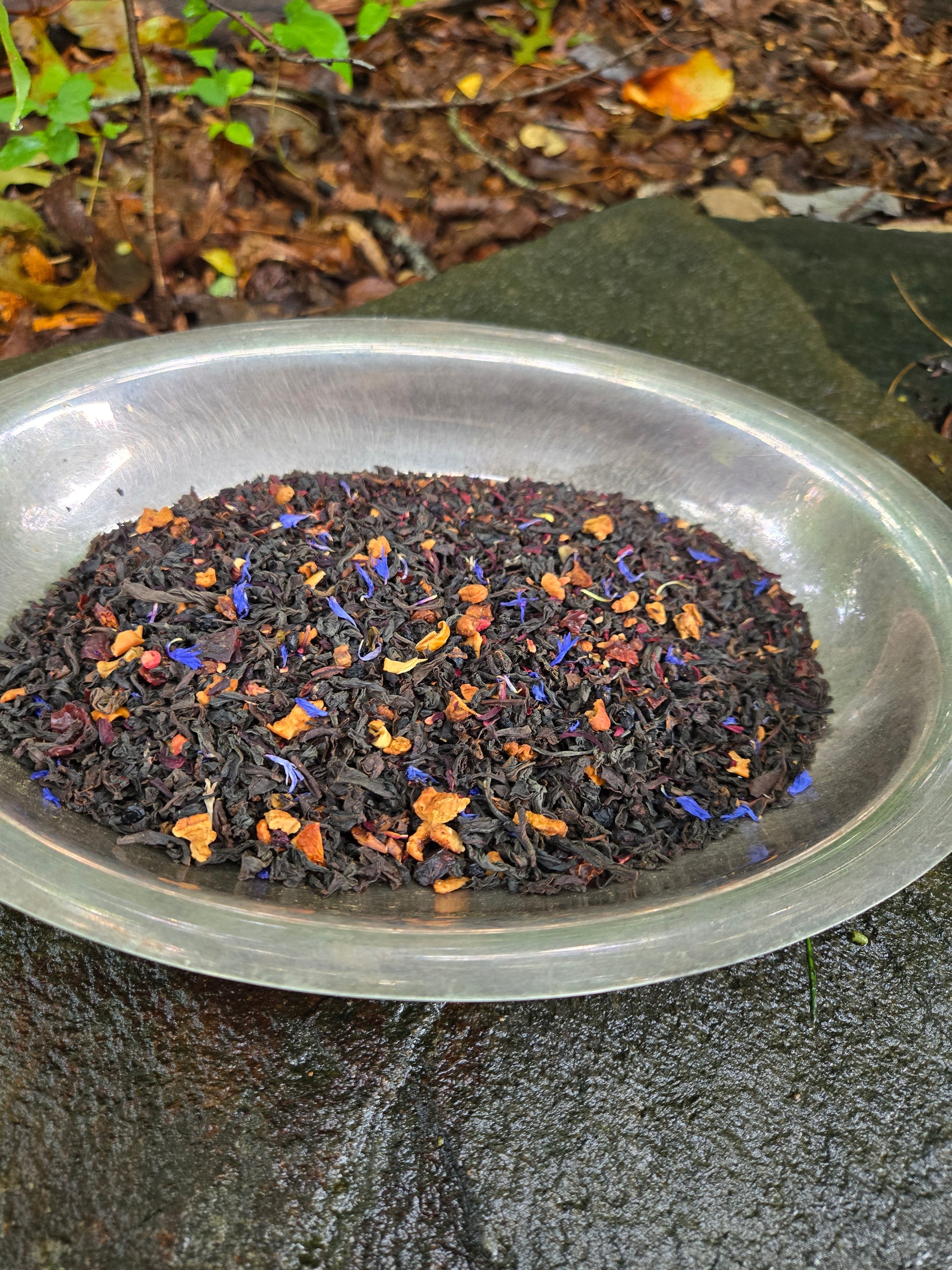 ingredients: black tea, dried apple, hibiscus, elderberry, rose hip, pomegranate bits, cornflowers, blueberries, natural flavors