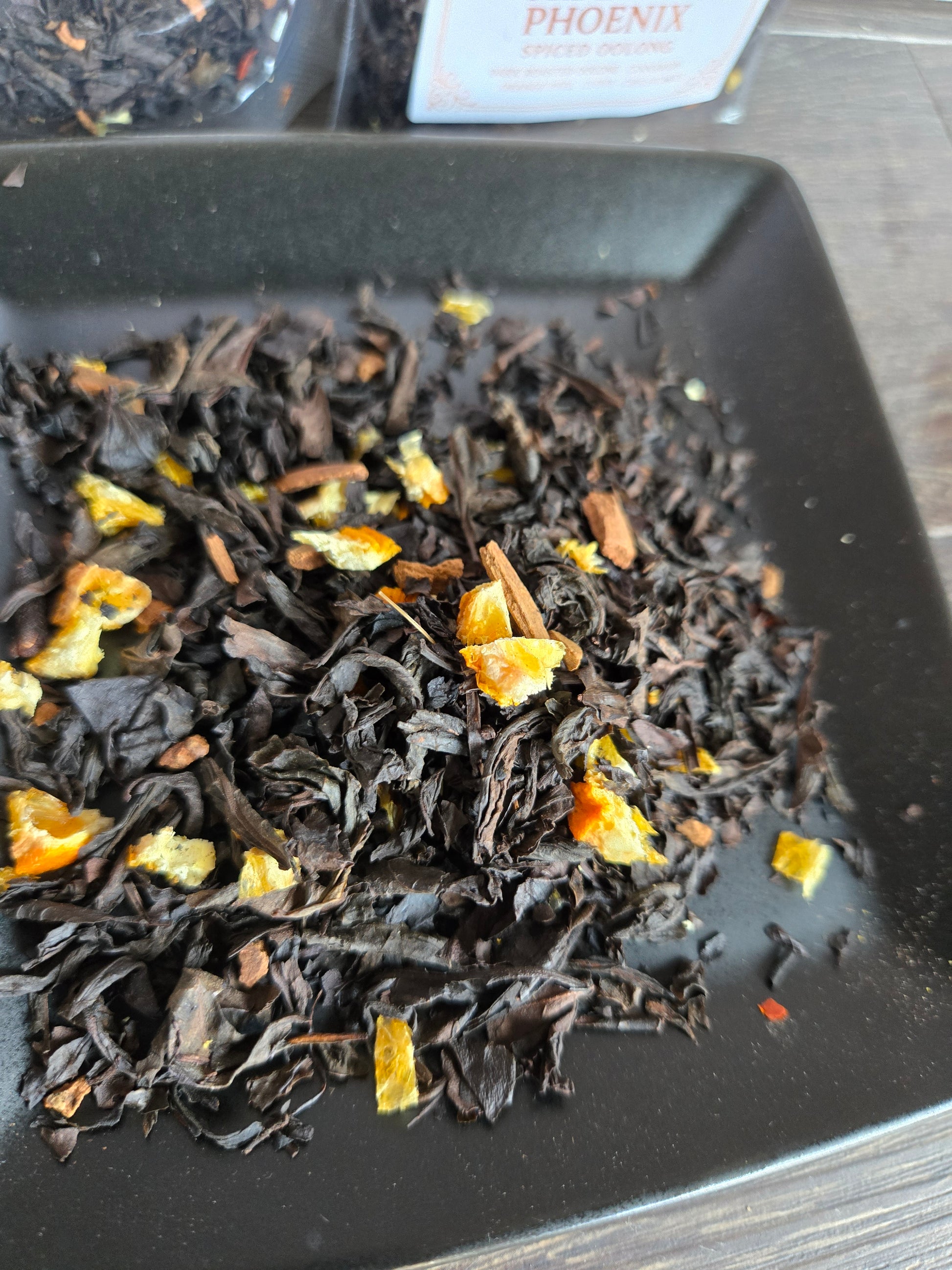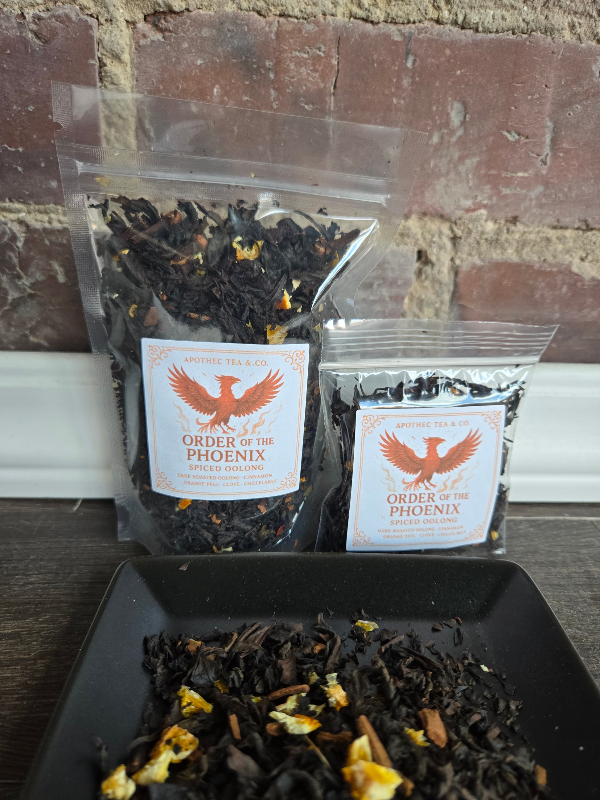 Rise from the ashes with this bold, fiery creation. Order of the Phoenix begins with a deep, roasted Wuyi oolong, layered with warming cinnamon and clove, bright citrus peel, and just a spark of chili heat. The result is a cup that’s comforting yet courageous — smooth at first sip, with a glowing warmth that lingers.