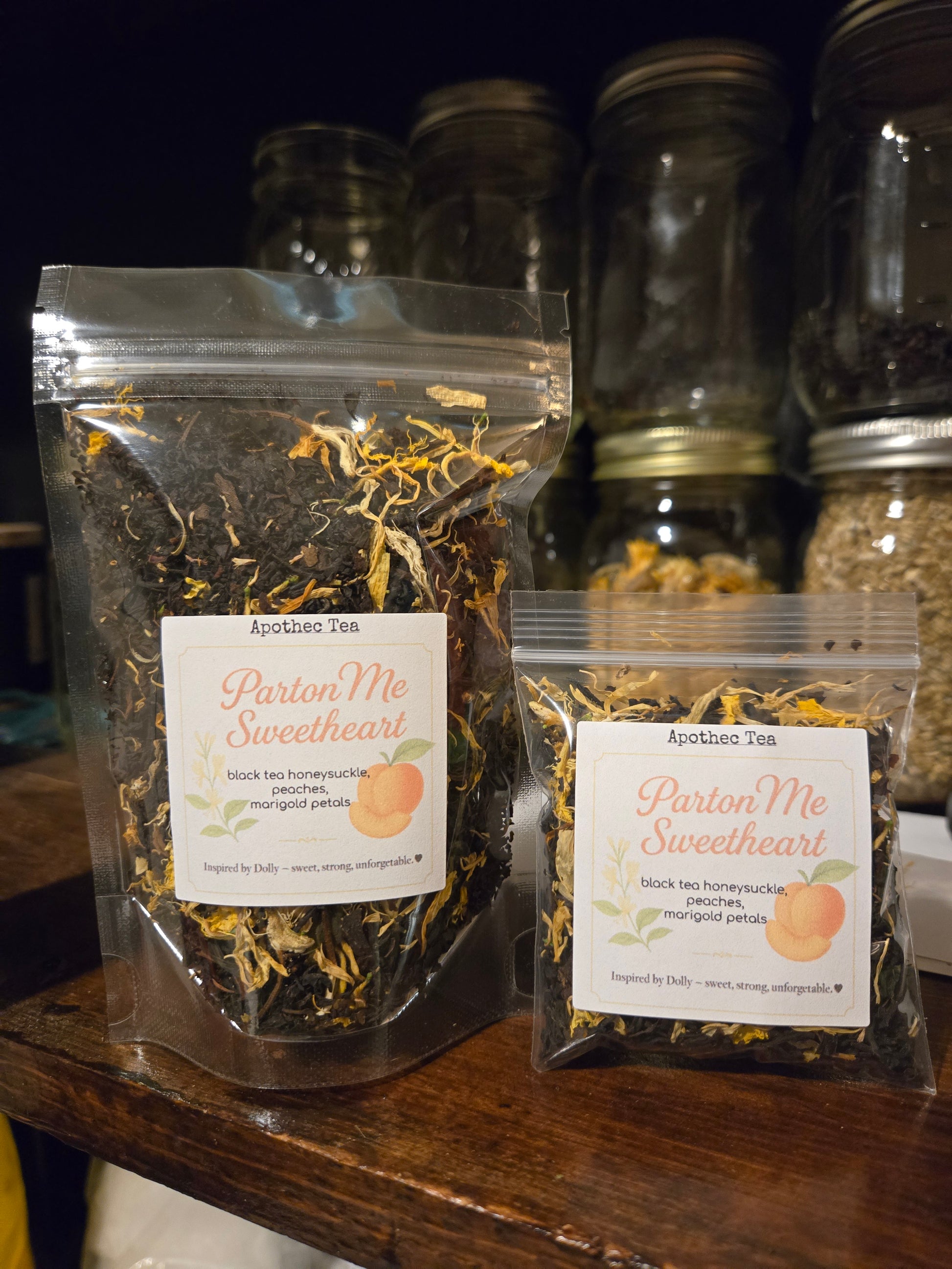 Parton Me, Sweetheart blends black tea with golden peach and a whisper of honeysuckle.