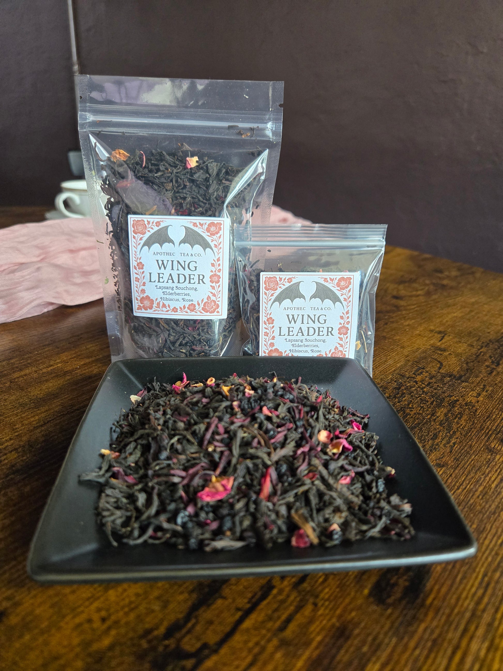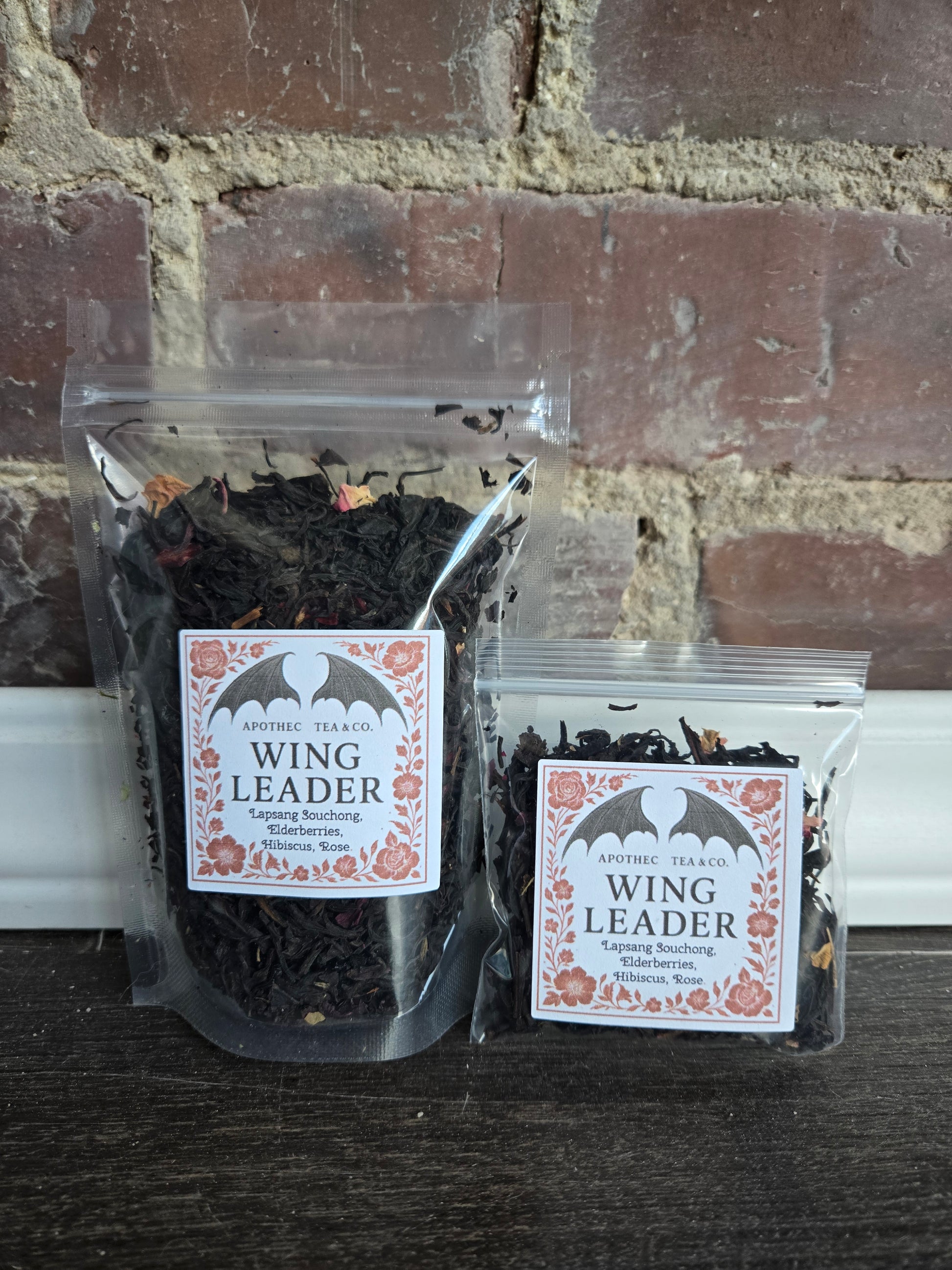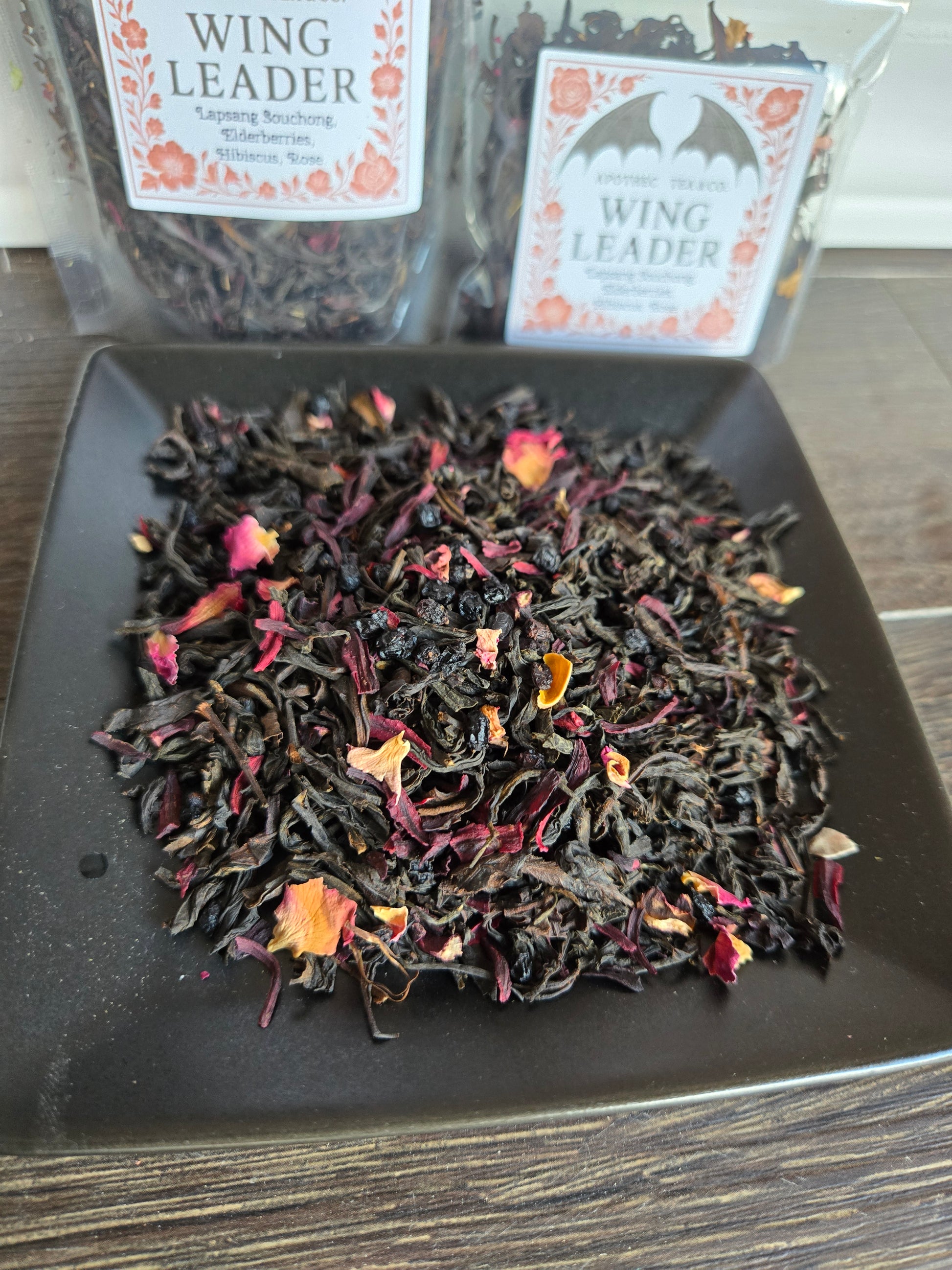 Bold, smoky, and dangerously alluring—Wing Leader is a tea worthy of Manon Blackbeak herself. With a dark, smoldering base of Lapsang Souchong, this blend captures the stormy skies and relentless power of the Wing Leader and her wyvern. Hints of elderberry and hibiscus bring a blood-red depth and tang, while delicate rose petals add a touch of unexpected beauty—sharp and striking, just like Manon.